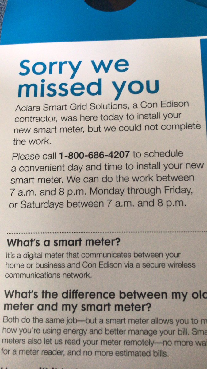 Con Edison On Twitter Rogueknits Hey There You Would Have To Call Aclara Smart Grid Solutions At 800 686 4208 To Schedule An Appointment To Install Your New Smart Meter Thank You Jr Twitter